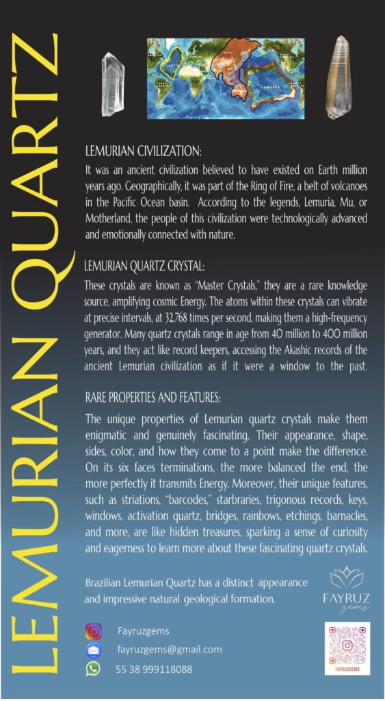 The Lemurian quartz crystal is a marvel of nature and a powerful tool for spiritual growth. It has the unique ability to tune into your spiritual compass, unlocking the secret doors of your soul. Its unique appearance is distinct from a standard quartz crystal and is a testament to its spiritual significance; with alternating patterns of horizontal striations or grooves, it resembles a ladder or ‘bar codes’ or to the rings of a tree trunk with smooth sides. Each line and groove records information similar to the hieroglyphics of ancient Egyptian cultures. When viewed from the top, this unique appearance and its tapering educational insight into the crystal’s unique features, tapering size, and hexagonal form make the Lemurian quartz crystal a fascinating subject of study.